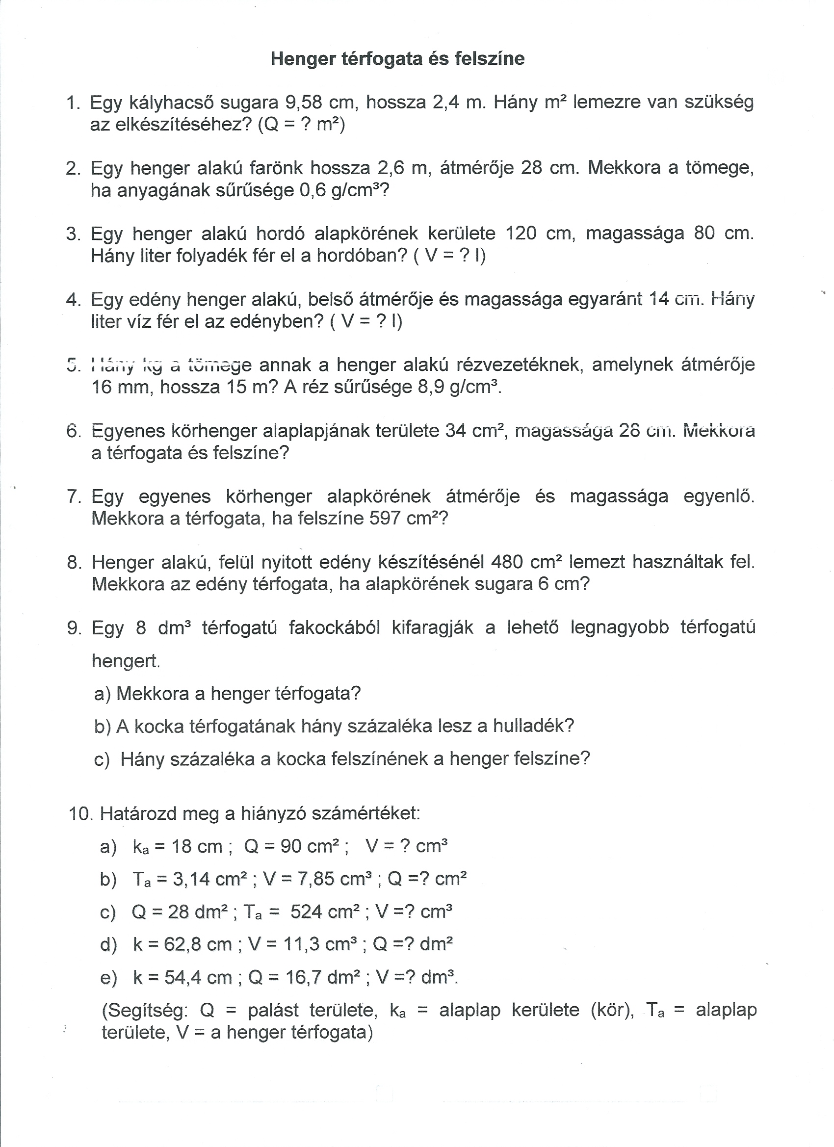 Még mielőtt rátérnék a mai napi feladatokra, egy pár észrevétel az írásbelikkel kapcsolatban. Úgy látom, többségben vele bírtatok a hengerrel, ennek örülök. Kijavítottam az írásbeliket. Tiszteletem azoknak, akik vállalták önmaguk képességeit, és ennek tudatában oldották meg az írásbelit, mindennemű külső segítség igénybevétele nélkül. Kalapemelés! Sajnos voltak páran, akik nem éppen a fair play szabályait szem előtt tartva dolgoztak (akinek nem inge, ne vegye magára!). Úgy döntöttem, hogy nem osztályozom az írásbeliket. Mindenesetre felteszem a javítókulcsot, így mindenki összehasonlíthatja vele a megoldásait. henger - megoldások.pdf (622536)